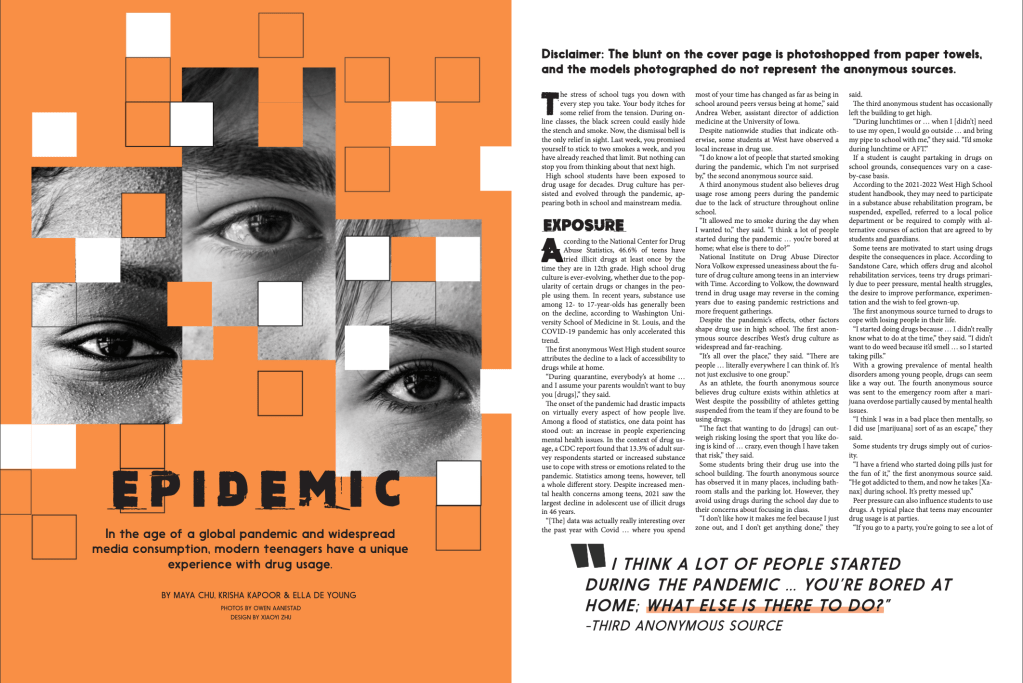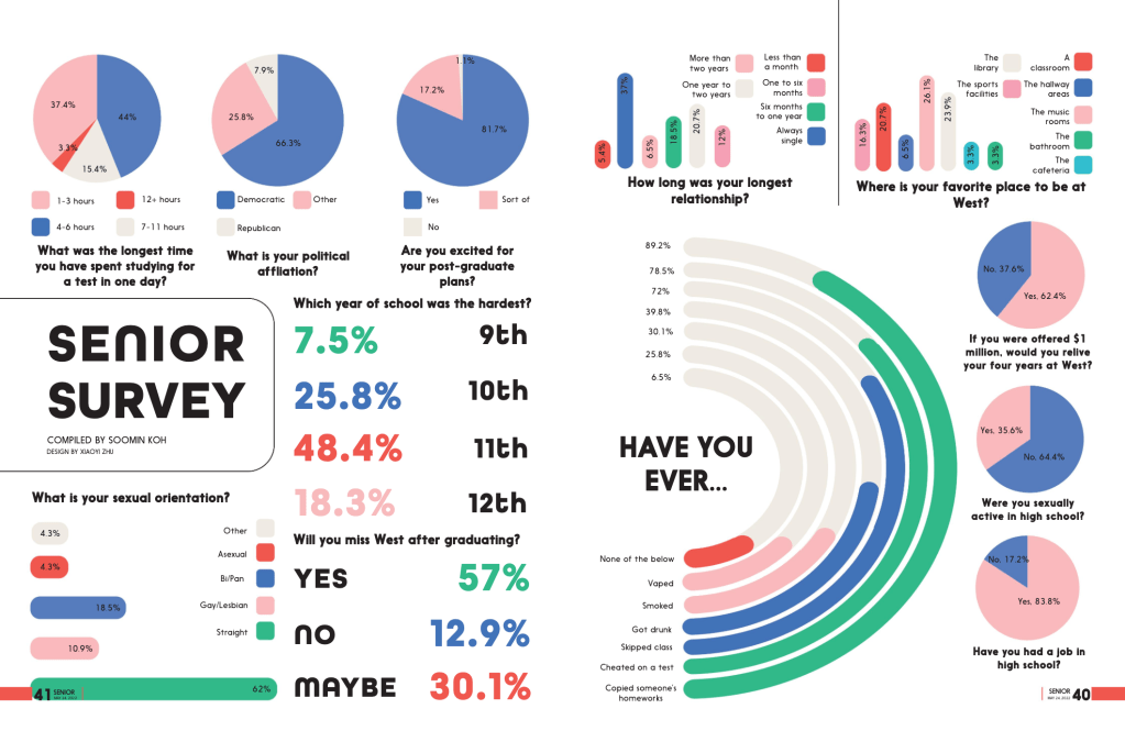 Hi, my name is Xiaoyi Zhu, and I am the design editor for West Side Story. Being on staff for three years, I learned valuable design skills and life lessons. One design skill I learned is to be resourceful. I like to scour the web for design inspirations and seek new adobe suite techniques. Sometimes inspiration doesn’t have to come from online; it could stem from your surroundings or your peers. Being curious has helped me develop my design style and open-mindedness toward new creative trends. Working in the journalism room has taught me the importance of community. I’ve watched the EICs and design editors that come before me establish strong values and connections between the staff members. I could feel a sense of belonging and safety in the newsroom. This work environment fosters great discussions for ideas and, most importantly, understanding and efficiency in producing works. Creating a respectful and positive work environment has been my goal as the design editor.